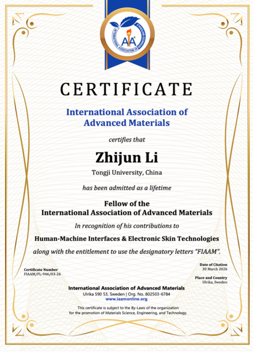近期,实验室主任李智军教授以其在“Human-Machine Interfaces & Electronic Skin Technologies”(人机交互界面与电子皮肤技术)方面所做出的杰出贡献,当选为国际先进材料学会终身会士 (Fellow of the International Association of Advanced Materials, FIAAM)。